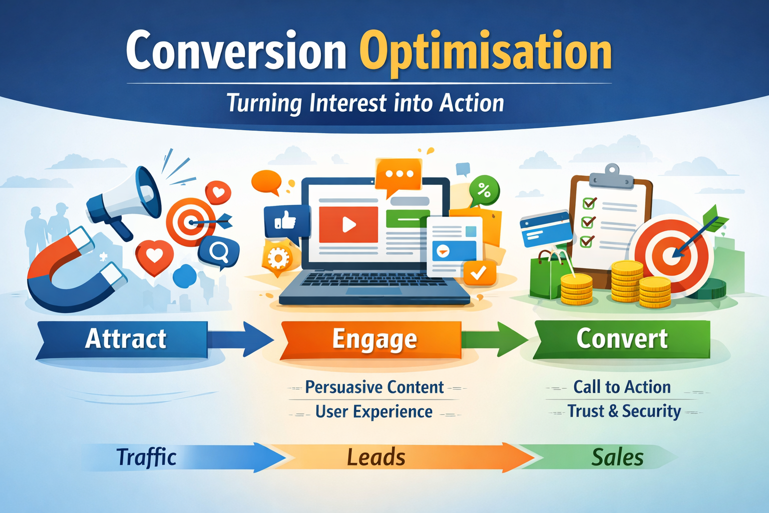 Traffic means nothing without conversions. We refine every touchpoint—from ad creatives to landing pages and funnels—to remove friction and inspire action, transforming clicks and interest into qualified leads, customers, and measurable revenue.
